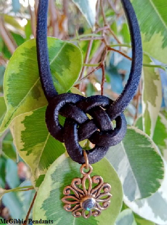 Kette, mit Josephine’s Knot aus schwarzem Leder, mit Bronze-Anhänger mit Paua-Muschel “Blume der Liebe”. Die Kette hat einen aufwendigen Bronze Knebelverschluß . Länge: ca. 25 cm